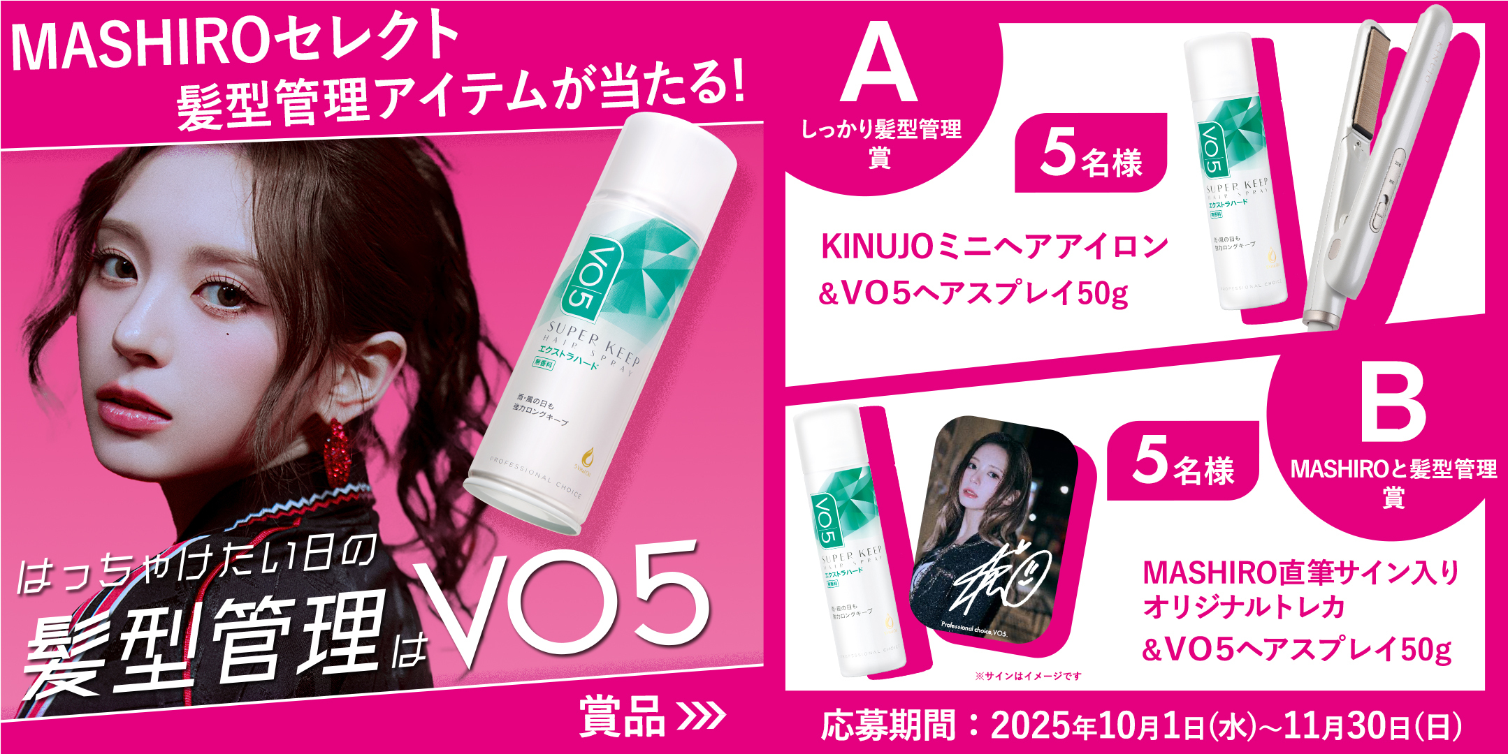 そしてファン垂涎のアイテムも登場。MASHIROがパッケージデザインを手がけた限定版VO5<エクストラハード>(無香料・330g)は、数量限定で発売され、ミニサイズ(20g)のスプレーがセットに。ライブや推し活、特別な一日も、これ1本で“自分史上最強ヘア”がキープできます。